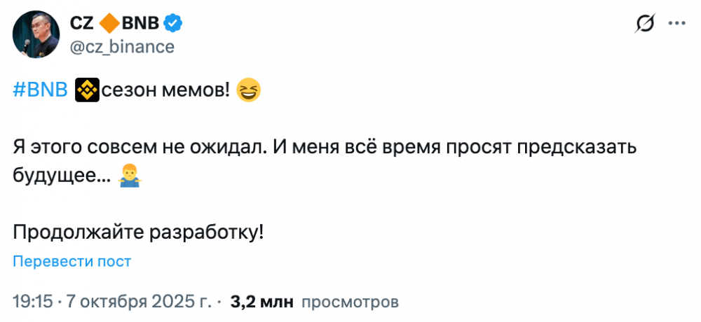 «То, что вы видите в меме о BNB Chain, — это осознание того, что рынок стал ведущей экосистемой для трейдинга», — добавил он.