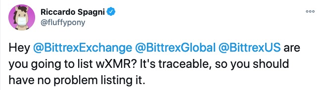 «Привет, BittrexExchange, BittrexGlobal и BittrexUS! Вы собираетесь размещать wXMR? Он отслеживается, поэтому у вас не должно возникнуть проблем с его листингом», - написал он в Твиттере.
