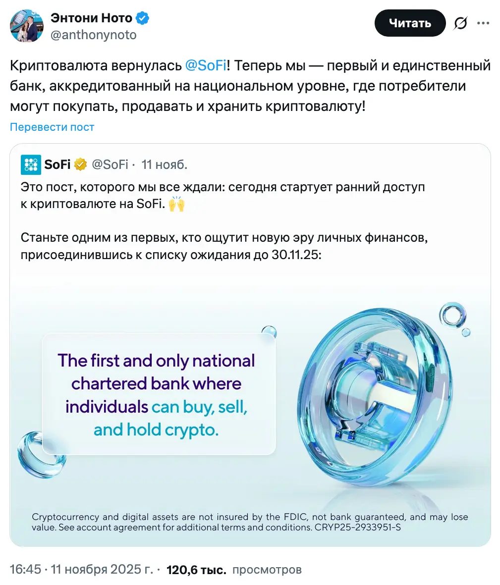 SoFi также планирует выпустить SoFi USD, стейблкоин, обеспеченный долларовыми резервами один к одному, и интегрировать криптовалюты в свои кредитные и инфраструктурные сервисы для заимствований и быстрых платежей.