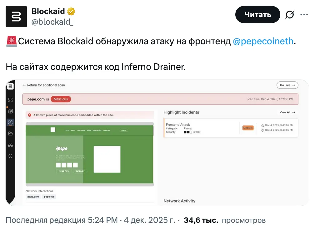 «Мы обнаружили код Inferno Drainer во фронтенде Pepe. Он относится к известному семейству вредоносных программ, которые мы регулярно выявляем. Это компрометация фронтенда: пользователей перенаправляют на поддельный сайт, который внедряет вредоносный код для опустошения кошельков».