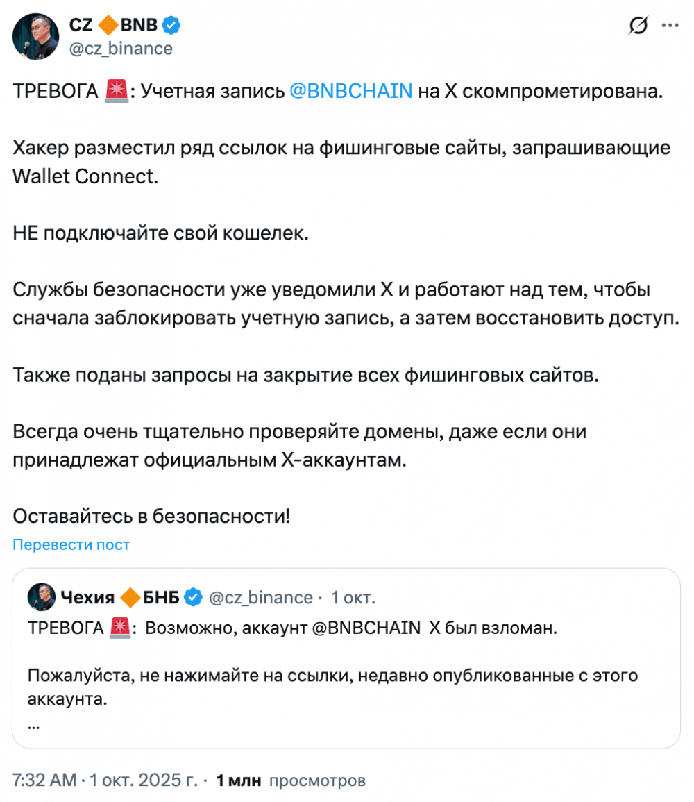 Сооснователь Binance Чанпэн «CZ» Чжао предупредил о взломе и призвал пользователей не взаимодействовать с ссылками до решения проблемы.