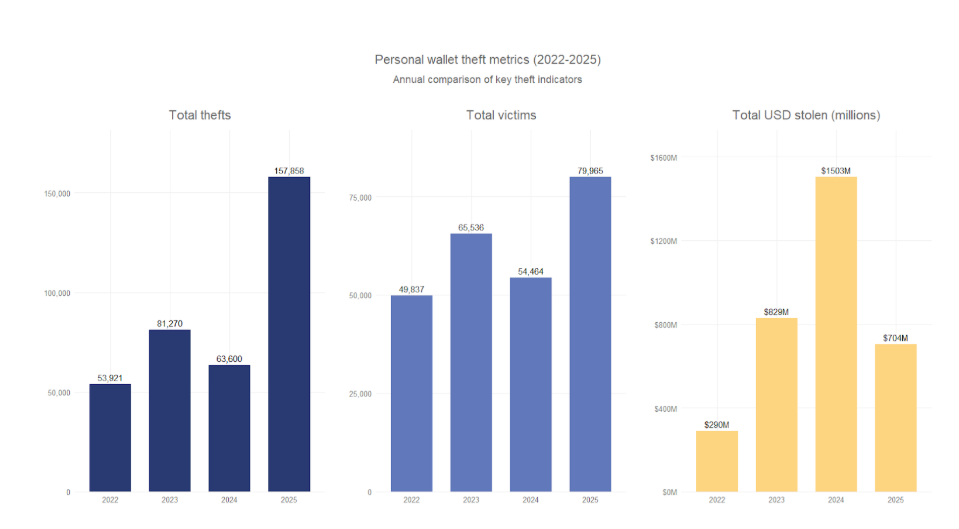 Общий объем похищенных средств при атаках на индивидуальные кошельки сократился с $1,5 млрд в 2024 году до $713 млн в 2025 году, хотя число инцидентов при этом почти утроилось по сравнению с 2022 годом.