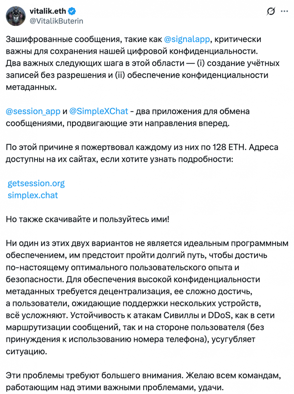 Бутерин указал, что децентрализованные мессенджеры Session и SimpleX Chat «двигаются в этом направлении». Он сообщил, что направил по 128 ETH каждому из проектов и призвал пользователей опробовать эти приложения.