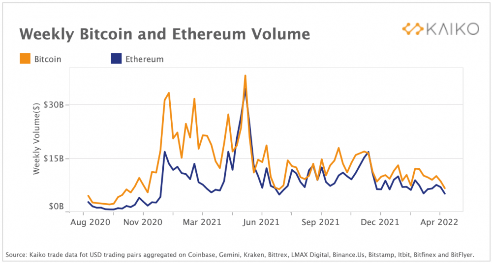 Устойчивое снижение можно объяснить несколькими факторами, включая доминирующие криптобиржи Binance и решение FTX сократить кредитное плечо, снижение интереса к криптовалютным фьючерсам и, в последнее время, снижение спекулятивного интереса, о чем свидетельствует снижение объемов торгов. Данные, отслеживаемые Kaiko Research, показывают, что еженедельные объемы торгов биткоинами и эфиром снизились до самого низкого уровня с лета 2021 года.