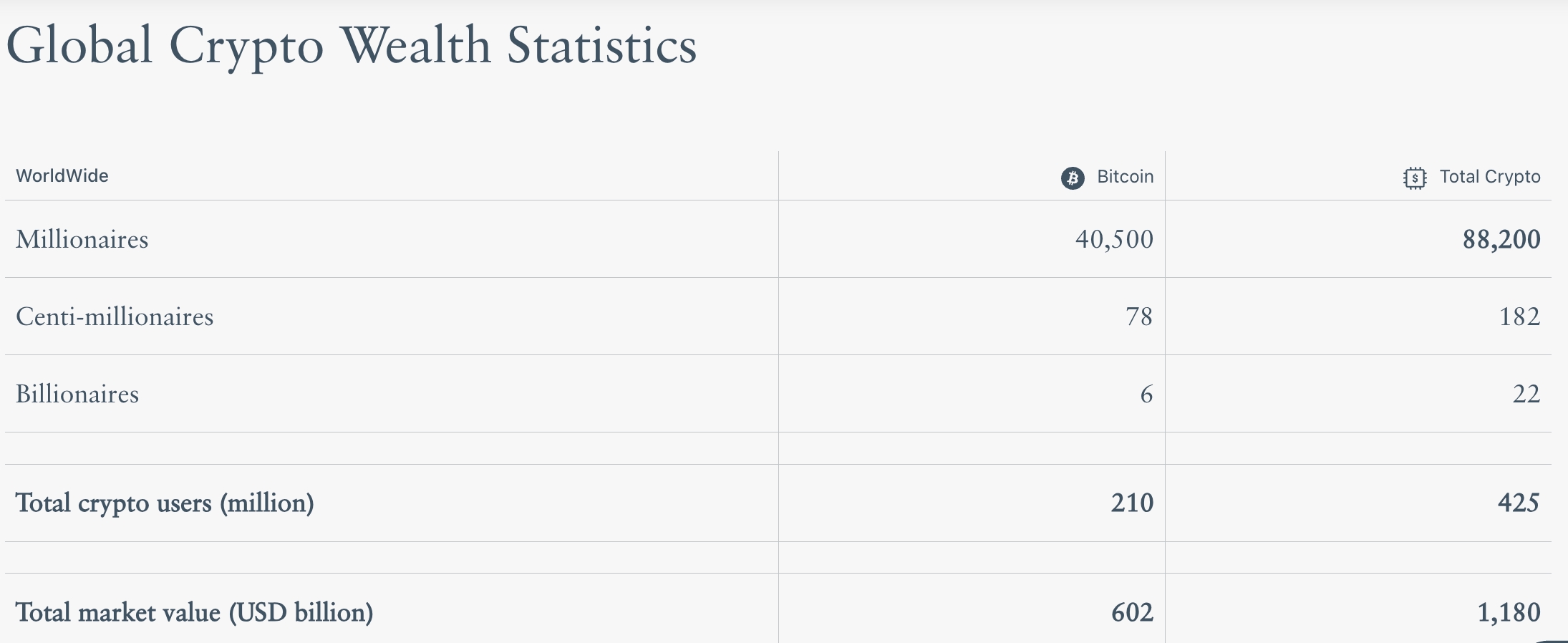 Согласно «Отчету о криптовалютном богатстве», опубликованному 5 сентября, Henley & Partners сообщила, что во всем мире насчитывается около 88 200 миллионеров с криптовалютными активами, из которых 40 500 владеют биткойнами.