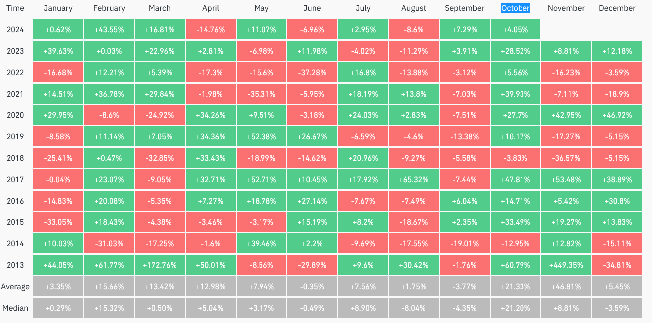 «Uptober» — оптимистичный термин для октября, в котором цена биткоина выросла в девяти из последних 11 октября, — часто дает старт сильным четвертым кварталам для биткоина, показывают данные CoinGlass.