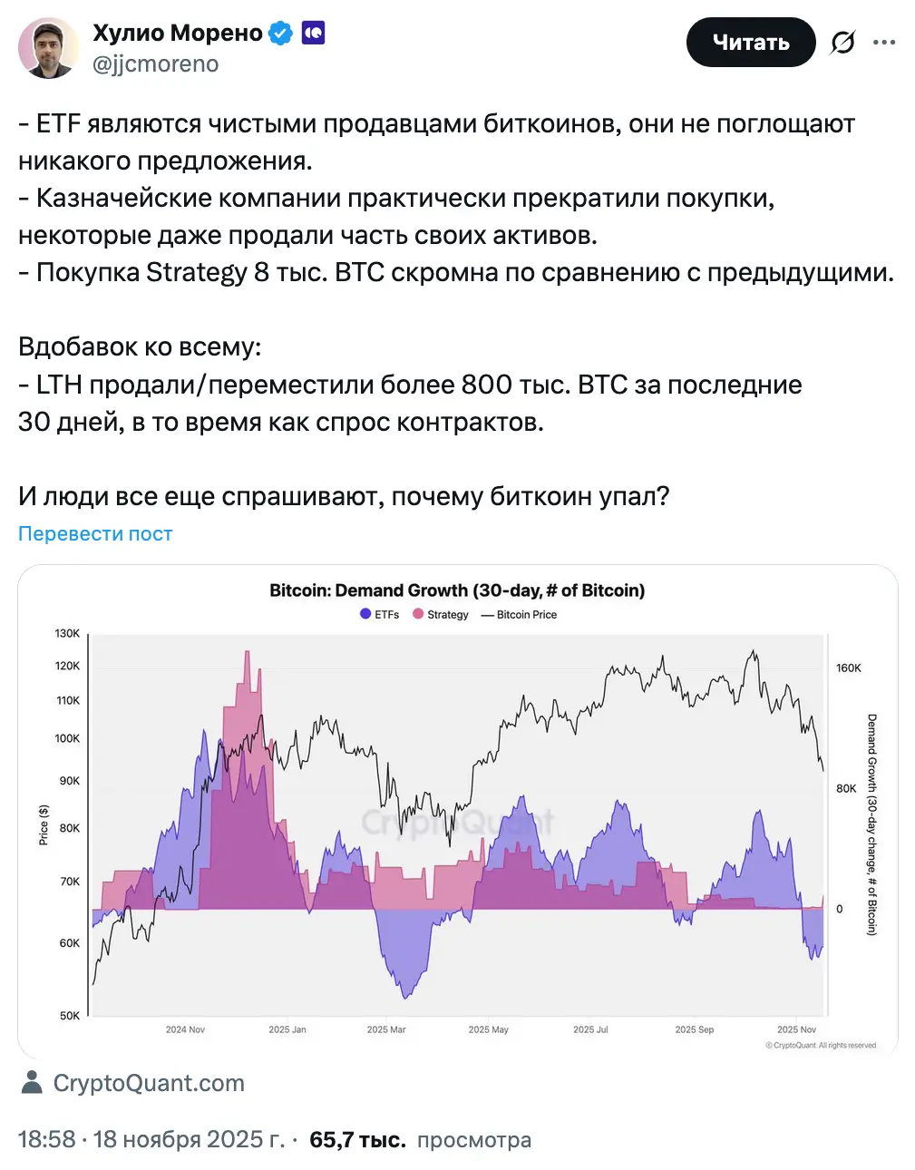 «Компании с казначействами практически прекратили покупать, некоторые даже продали часть своих активов», — констатировал Морено, ссылаясь на такие компании, как Metaplanet, которая последний раз покупала BTC в сентябре.