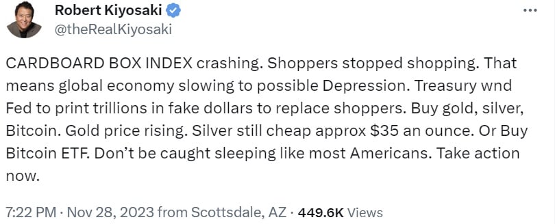 Во вторник Кийосаки опубликовал сообщение на платформе социальных сетей X, в котором выразил обеспокоенность по поводу индекса картонных коробок, показателя, используемого некоторыми инвесторами для оценки производства потребительских товаров, который, по его словам, терпит крах. Кийосаки заявил, что покупатели перестали делать покупки, что указывает на потенциальный глобальный экономический спад, который может привести к депрессии. Он ожидает, что Казначейство и Федеральная резервная система отреагируют печатанием триллионов фальшивых долларов.