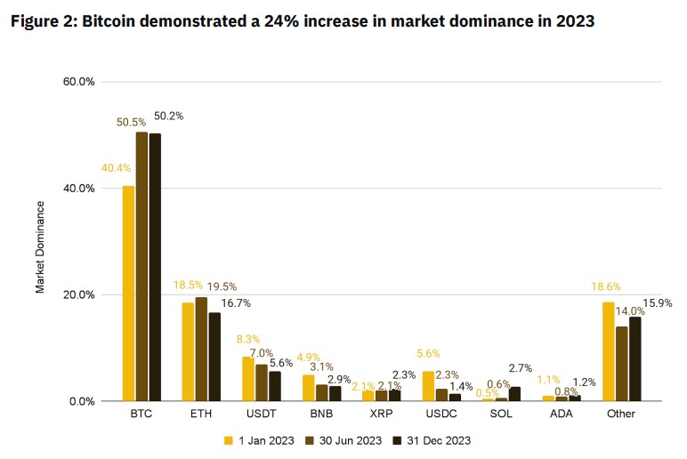 Биткоин продемонстрировал увеличение доминирования на рынке на 24% в 2023 году. Источник: Binance