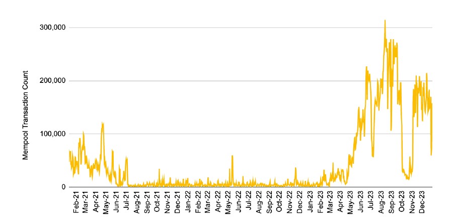 Количество транзакций биткоин-мемпула с февраля 2021 по декабрь 2022. Источник: Binance