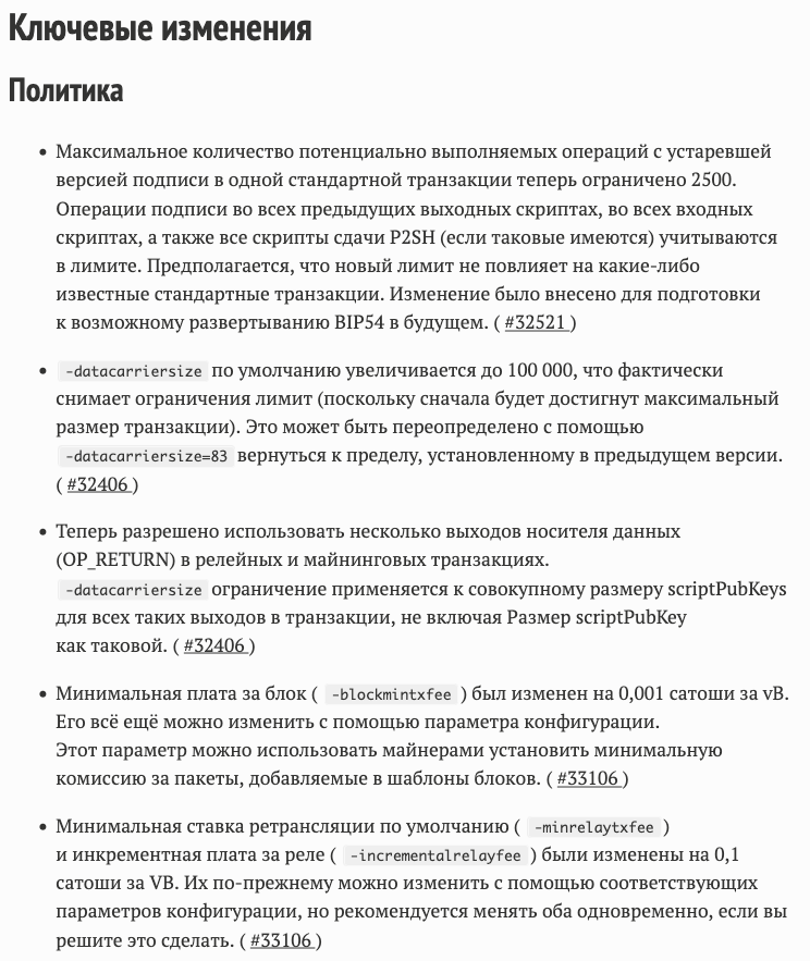 Хотя обновление также включает исправления ошибок, улучшения производительности и изменения комиссий, самым спорным вопросом стало увеличение лимита OP_RETURN.