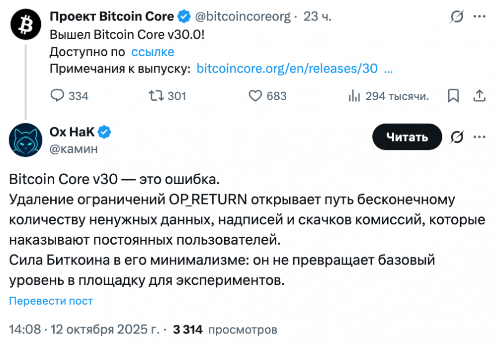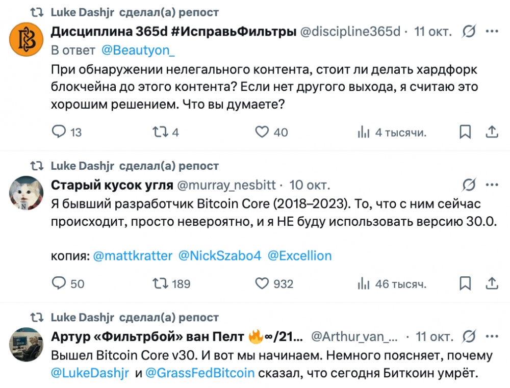 Протест сообщества против Bitcoin Core v30. Источник: X