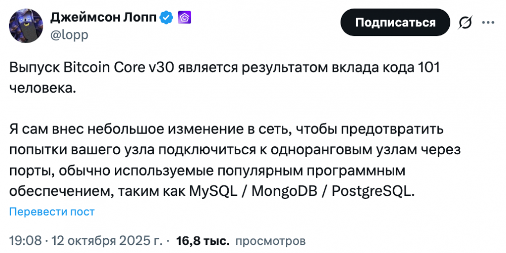 Павол Руснак активно поддерживает Bitcoin Core v30. Источник: Павол Руснак