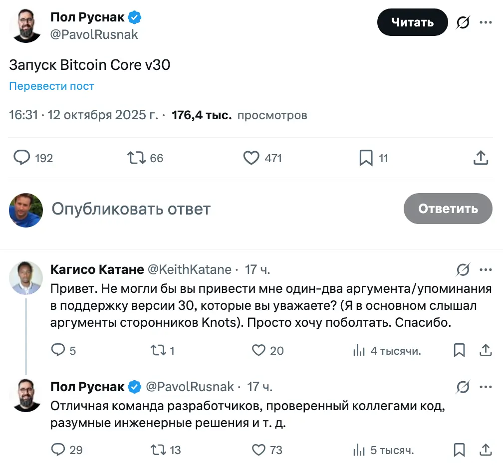 Соучредитель Satoshi Labs Павол Руснак также заявил, что выбрал Bitcoin Core v30 из-за «отличной команды разработчиков, проверенного кода» и «разумных инженерных решений».