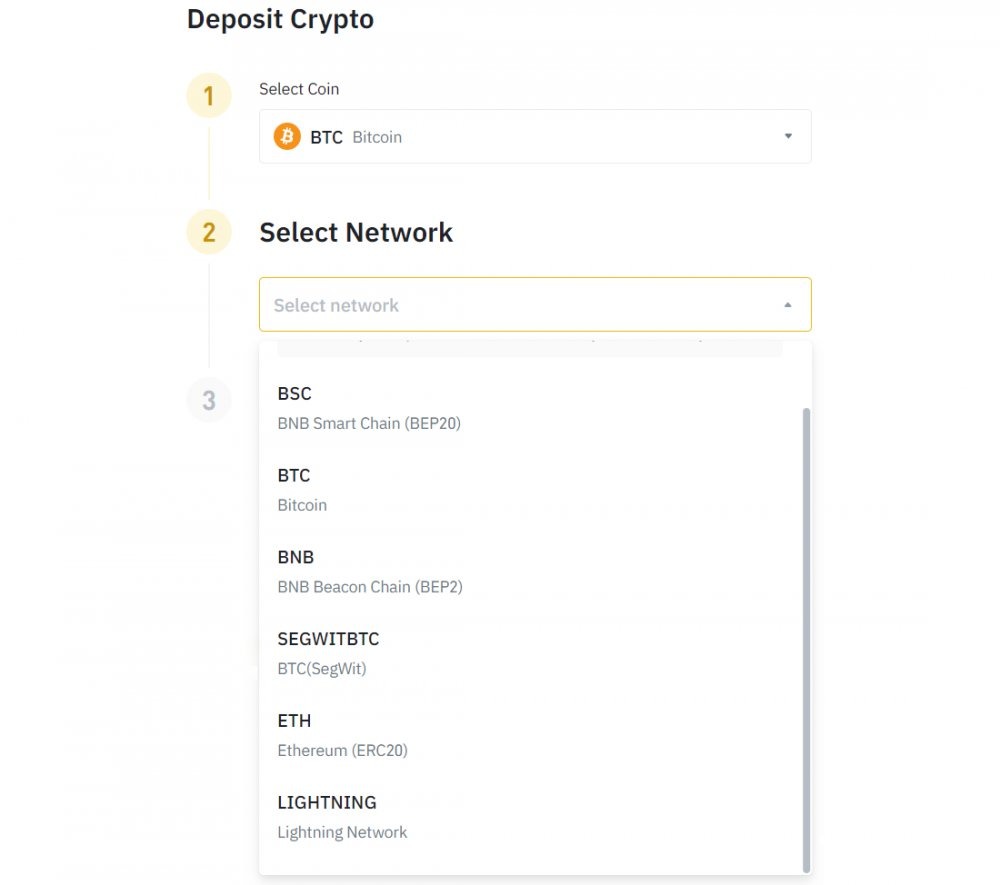 Снимок экрана, показывающий, что пользователи могут выбрать «LIGHTNING» в качестве опции при внесении биткойнов. Источник: Binance.