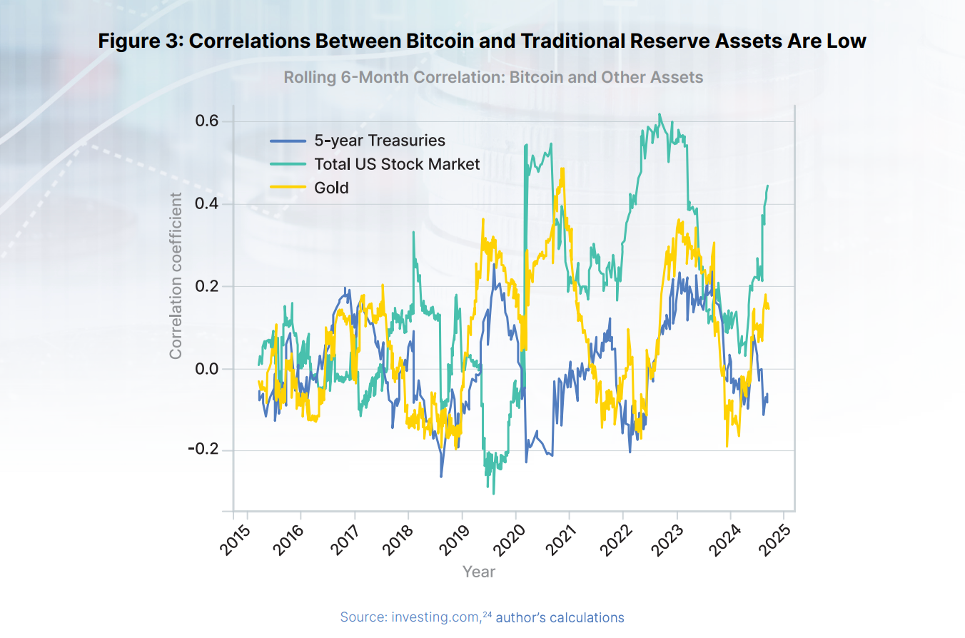 Корреляция между биткоином и другими резервными активами. Источник: Bitcoin Policy Institute.