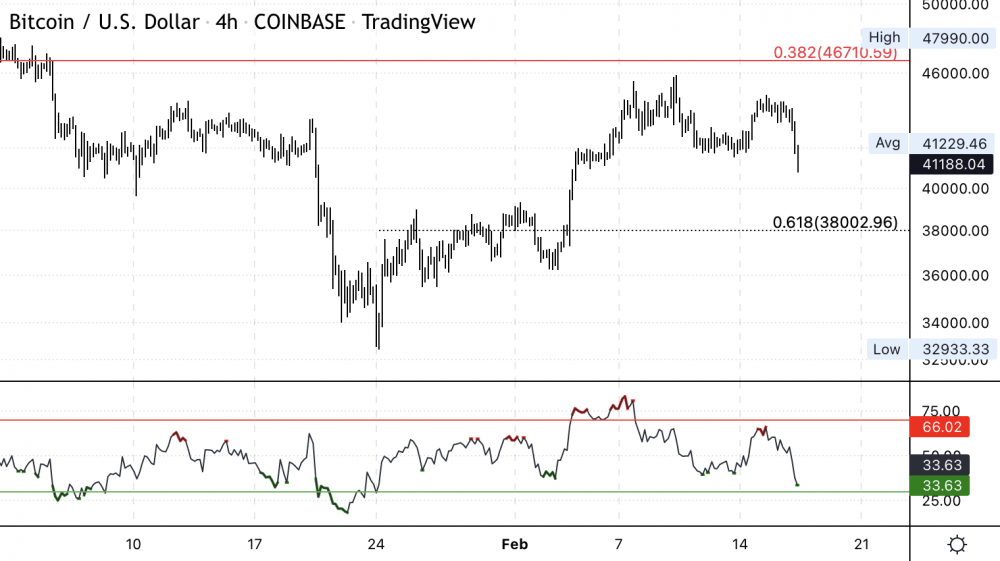 Индекс относительной силы (RSI) на четырехчасовом графике перепродан, аналогичный тому, который произошел 3 февраля, который предшествовал скачку цен на 20%. Однако на этот раз уровень сопротивления в 46 000 долларов США может удержать активных продавцов на пути к более сильной поддержке на уровне 30 000 долларов США.