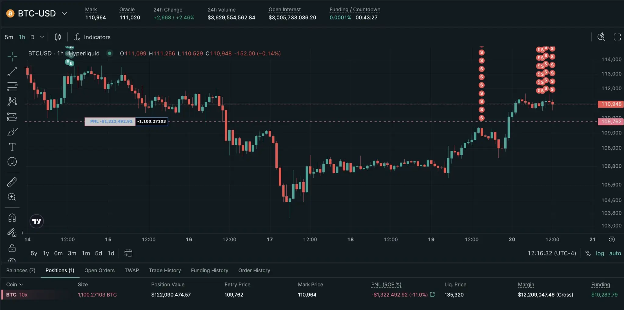 Инвестор открыл короткую позицию в понедельник, когда биткоин торговался по $111 190. Согласно данным блокчейна Hypurrscan, в настоящее время он несет нереализованный убыток в размере $2,6 млн по короткой ставке, которая будет ликвидирована, если цена биткоина превысит $112 368.