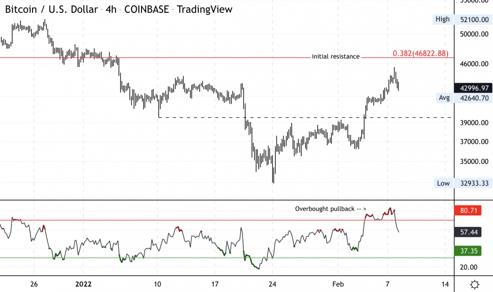 Индекс относительной силы (RSI) на четырехчасовом графике снижается с территории перекупленности, аналогично тому, что произошло в конце декабря на фоне краткосрочного нисходящего тренда. Однако на этот раз биткоин превысил предыдущие уровни сопротивления, а это означает, что текущий откат может стабилизироваться в ближайшее время. Одной из проблем является низкая убежденность покупателей, о чем свидетельствует низкий объем торгов во время недавнего ралли цен. Митинги с низким объемом обычно приводят к откатам или торговле в диапазоне до подтверждения более окончательного дна цены.