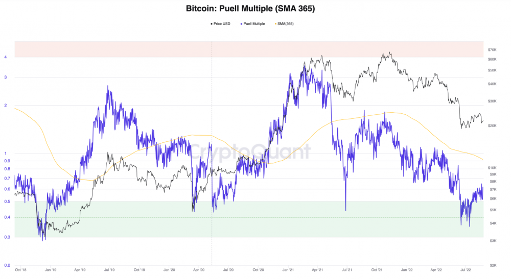 Puell Multiple, рассчитанный путем деления ежедневного выпуска биткойнов в долларовом выражении США на среднее значение за 365 дней, указывает на то, что недавно отчеканенные монеты недооценены по отношению к среднему за год. Для некоторых наблюдателей это показывает, что текущая прибыльность майнеров для продажи биткойнов относительно низка - шаг, который ранее отмечал нижний уровень цен. Аналитики CryptoQuant, однако, предупредили, что дно цен, вероятно, «все еще далеко» от формирования, сославшись на фундаментальные проблемы.