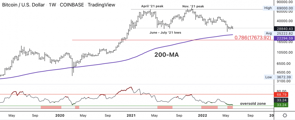 Вторичная поддержка находится на 200-недельной скользящей средней, в настоящее время составляет 22 294 доллара США. Тем не менее, резкое снижение цен может в конечном итоге стабилизироваться на уровне 17 673 долларов США, что на 78% от предыдущего восходящего тренда BTC с марта 2020 года по ноябрь 2021 года.