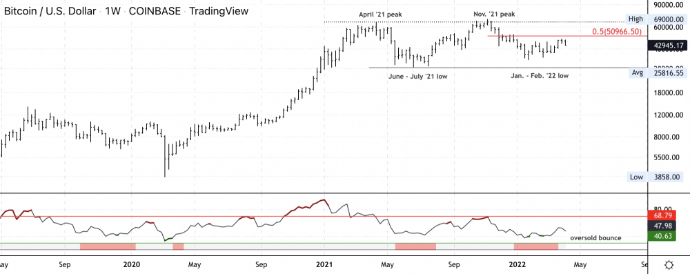 На недельном графике индекс относительной силы (RSI) упал ниже 50 нейтрального уровня. Это отражает небольшую потерю импульса с момента прорыва BTC выше 40 000 долларов 28 марта. Тем не менее, нынешний откат кажется временным, похожим на то, что произошло в сентябре прошлого года. Однако на этот раз спекулятивные активы, такие как акции и криптовалюты, вступают в сильный период в апреле и мае, что может привлечь краткосрочных покупателей.
