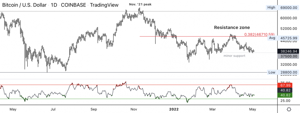 На данный момент покупатели не смогли поддерживать последовательные еженедельные закрытия выше 40 000 долларов США, что является серединой трехмесячного ценового диапазона.