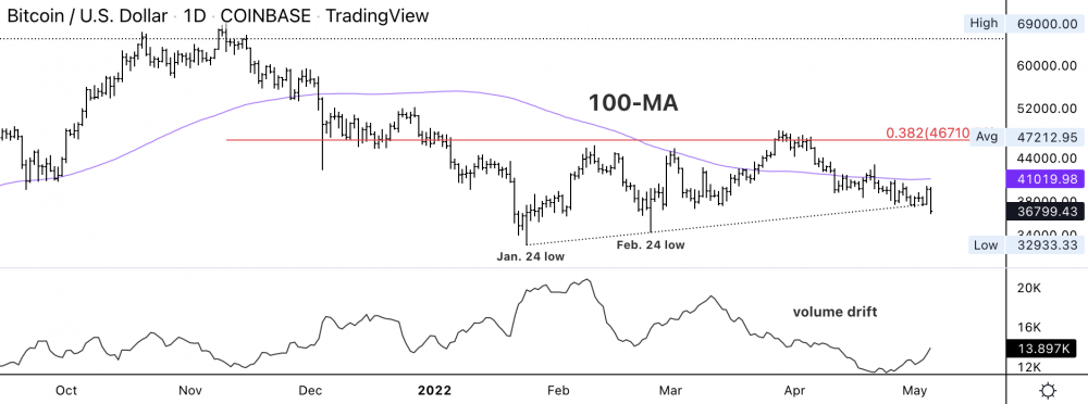 Наклон 100-дневной скользящей средней сглажен за последние несколько месяцев, что указывает на слабость на этапе облегчения с момента низкого уровня цены 24 января около 32 900 долларов. Непосредственное сопротивление составляет 40 000 долларов США, что может ограничить покупательскую активность в краткосрочной перспективе. Кроме того, объем продаж не так экстремален по сравнению с предыдущими падающими движениями цены. Это говорит о том, что дальнейший недостаток, вероятно, будет до того, как продавцы капитулируют.