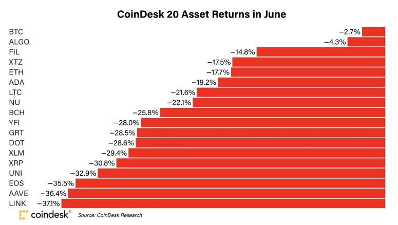 Биткоин превзошел другие крупные криптовалюты с рыночной капитализацией в июне со снижением на 2,7% по сравнению со снижением более чем на 30% XRP, EOS и LINK. Снижение альткоинов стабилизировало коэффициент доминирования биткоина, или относительную долю рынка, примерно на 45%. Однако есть признаки того, что спрос на альткоины вырос в последние недели.