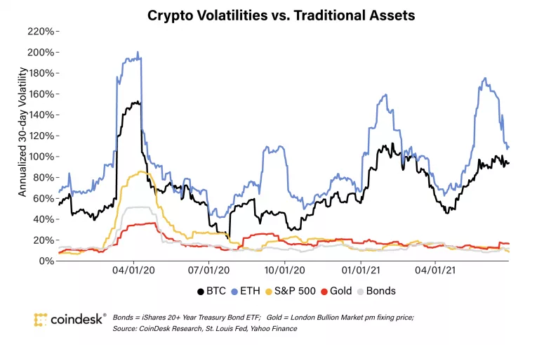 Волатильность биткоина и эфира остается повышенной, хотя и ниже максимумов января 2020 года. В то время как обе криптовалюты пережили крайне нестабильные колебания за последний год, традиционные рынки оставались относительно спокойными.