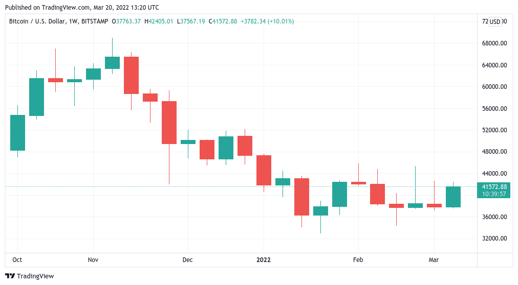 Данные Cointelegraph Markets Pro и TradingView показали, что BTC/USD маневрируют вокруг верхней зоны 41 000 долларов в воскресенье. Поздний всплеск в пятницу широко продолжался, и в субботу на Bitstamp вернулся к 42 400 долларов, что соответствует максимуму с начала марта. Теперь еженедельный график, похоже, обеспечил лучшее еженедельное закрытие биткоина с начала февраля.