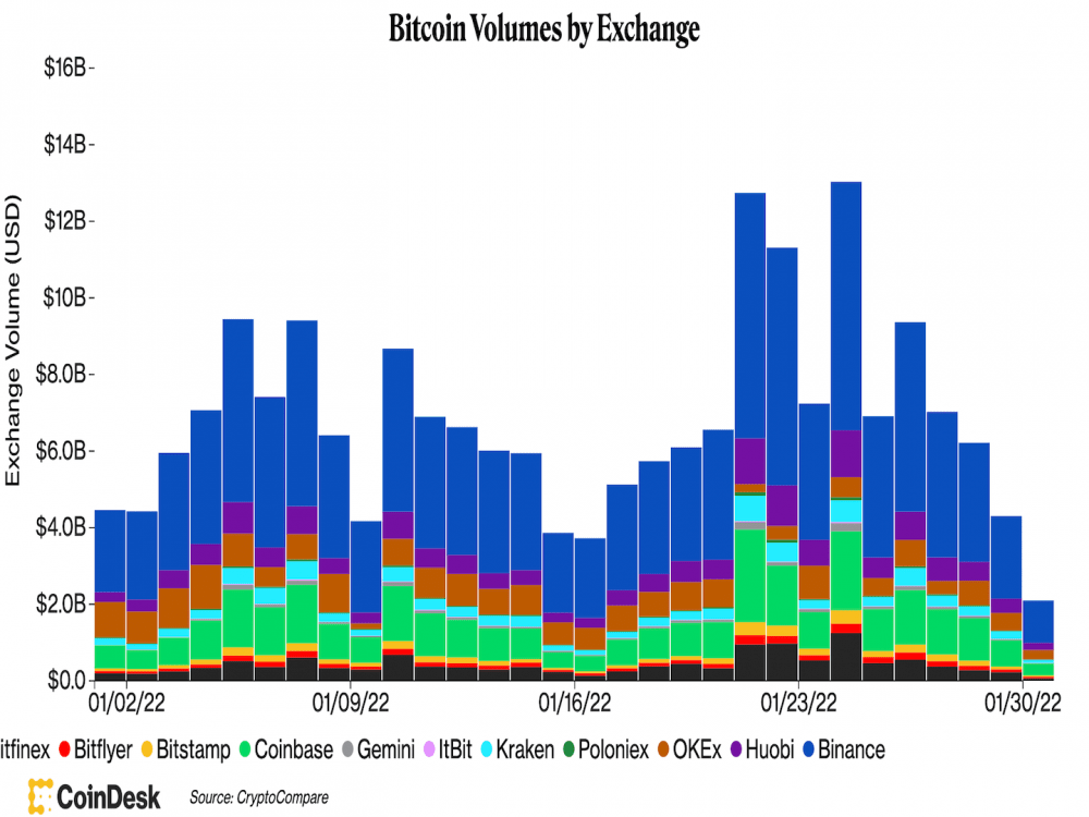 Согласно данным CoinDesk, на момент публикации самая старая криптовалюта переходит из рук в руки по цене 38 100 долларов, что немного больше за последние 24 часа. Ether, вторая по величине криптовалюта по рыночной капитализации, торговалась более чем за 2600 долларов США немного выше за тот же период. Данные, собранные CoinDesk, показывают, что объем торгов биткоинами на крупных криптобиржах значительно упал в минувшие выходные по сравнению с прошлой неделей.