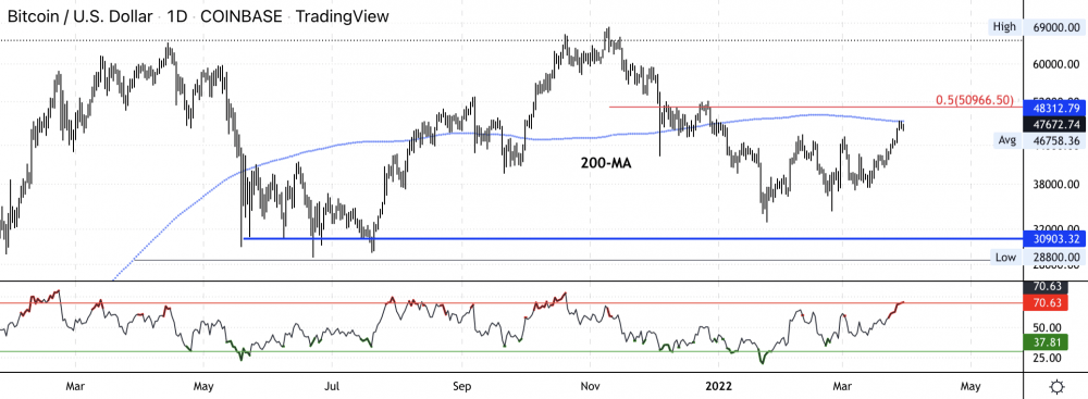 Биткоин пытается прорваться выше узкого торгового диапазона от 46 000 до 48 000 долларов США, поскольку импульс остается положительным.