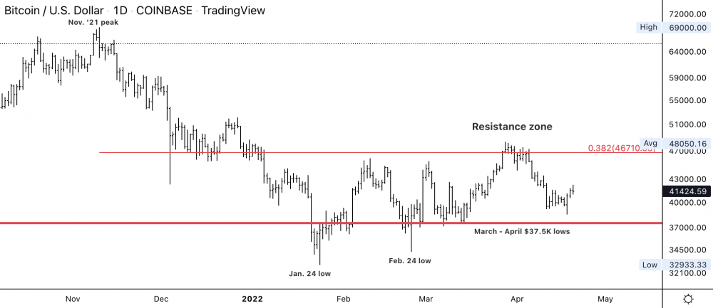 Следующий крупный уровень сопротивления составляет 46 700 долларов США, что ограничило ценовые митинги за последние несколько месяцев. Как правило, рост цен начинает останавливаться после отслеживания примерно от 38% до 50% преобладающего нисходящего тренда, аналогично тому, что произошло в сентябре прошлого года. Тем не менее, значительное замедление долгосрочного восходящего тренда BTC предполагает, что рост может быть ограничен в течение следующих нескольких месяцев.