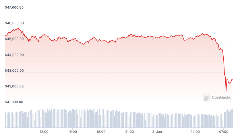 По данным CoinGecko, 3 января биткоин упал ниже 42 000 долларов, потеряв как минимум 3 000 долларов всего за два часа. На CoinMarketCap биткоин упал до 40 700 долларов с внутридневного максимума в 45 600 долларов, зафиксированного на момент написания.