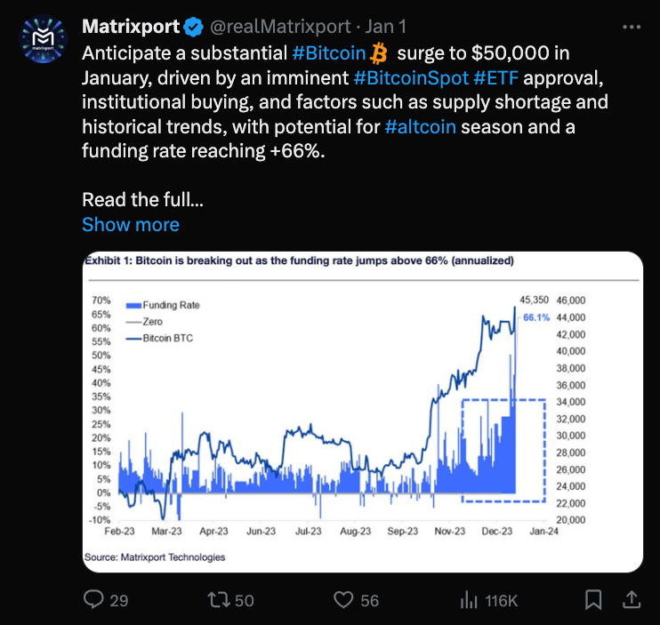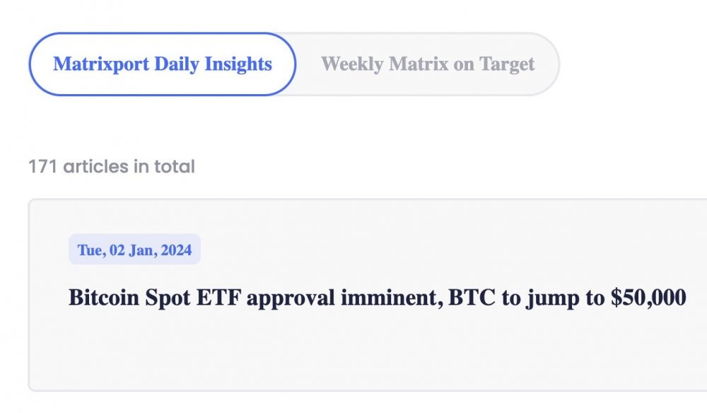 1 января Matrixport выразила на X (ранее Twitter) уверенность в том, что биткоин вырастет до $50 000, что обусловлено такими факторами, как «неизбежное одобрение спотового биткоин-ETF». Фирма также заявила, что о потенциальном одобрении спотового биткоин-ETF может быть объявлено даже раньше ожиданий большинства трейдеров 8, 9 или 10 января.