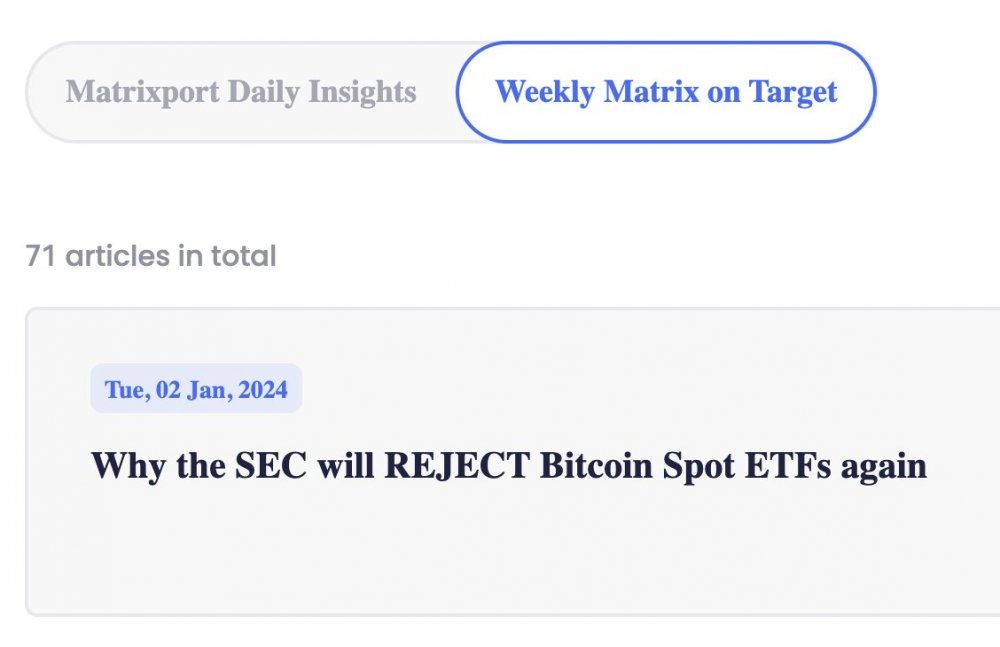 Всего через день после публикации прогноза о возможных одобрениях в 2024 году Matrixport изменила свой прогноз, обновив его 2 января, и заявив, что в январе SEC отклонит все заявки на спотовые биткоин-ETF и что одобрение спотового биткоин-ETF произойдет не раньше второго квартала этого года.