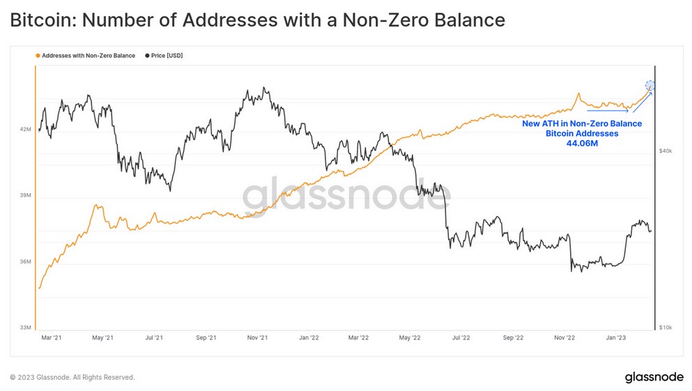 По данным криптоаналитической платформы Glassnode, запуск невзаимозаменяемых токенов Биткойн (NFT), известных как Ordinals, привел к тому, что количество ненулевых адресов Биткойн достигло нового исторического максимума в 44 миллиона.