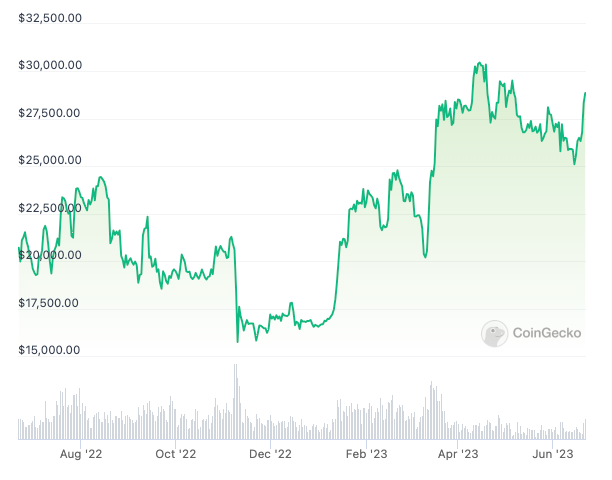 Согласно данным CoinGecko, биткойн торговался на уровне около 20 000 долларов, когда Economic Daily опубликовала статью в июне 2022 года. Двенадцать месяцев спустя, на момент написания, BTC торгуется на уровне 28 852 долларов, что на 36% больше.