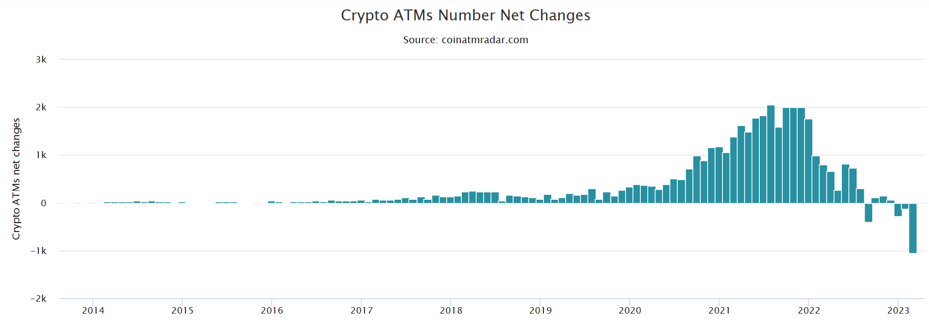 В январе 2023 года глобальная сеть Crypto Atm Setwork отключила 289 машин, и еще 123 крипто-ATM в феврале. Продолжающееся снижение было в первую очередь связано с геополитической напряженностью, потерей доходов и длительным медвежьим рынком. Поэтому поставщики услуг пробуют более дешевые альтернативы для операций.