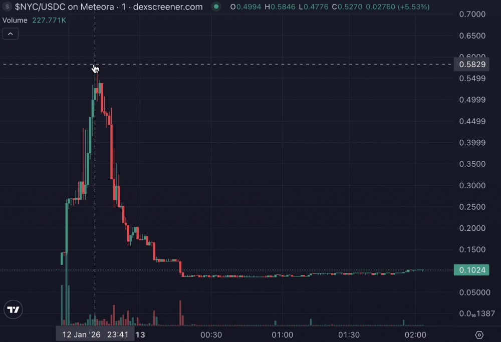 В понедельник Адамс представил «NYC Token» на пресс-конференции на Таймс-сквер, позиционируя его как криптовалютный проект, связанный с общественными инициативами. Вскоре после запуска рыночная капитализация токена взлетела до 580 000 000 долларов, что свидетельствует о высоком спросе со стороны розничных трейдеров и аналитиков рынка.