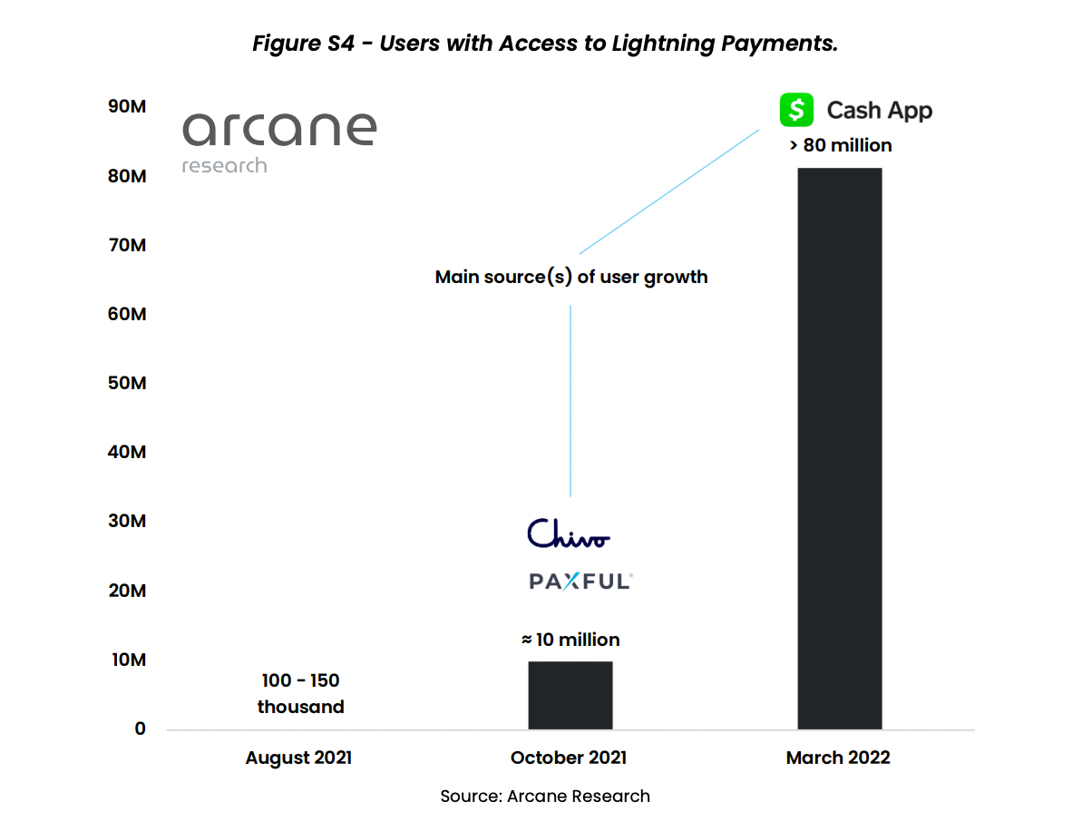 По оценкам Arcane, в августе 2021 года около 100 000 пользователей имели доступ к платежам Lightning. К марту этого года более 80 миллионов человек имели возможность доступа к платежам в Lightning Network, что свидетельствует о наличии большой потенциальной пользовательской базы.