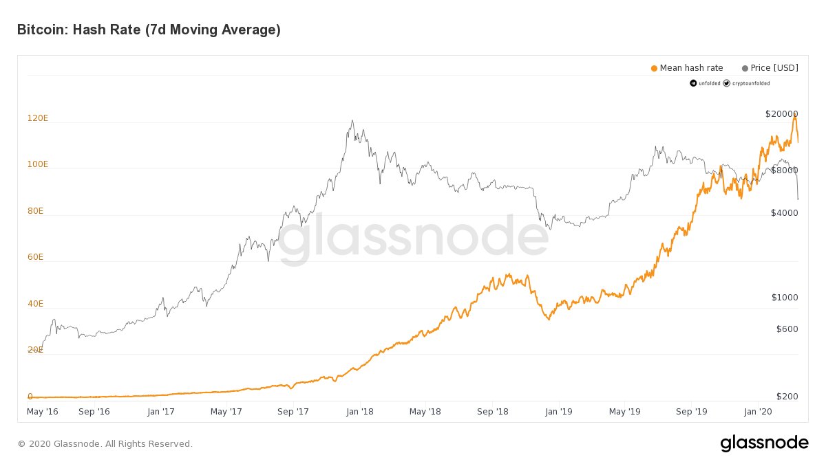 Если посмотреть на текущий биткоин-хэшрейт всех майнеров вместе взятых - мы увидим явное снижение, так как за последние пару недель хэшрейт упал на 20%.