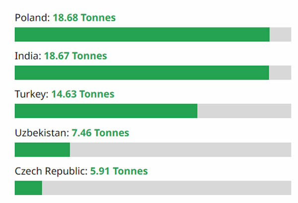 Национальный банк Польши, Резервный банк Индии и Центральный банк Турции были крупнейшими центральными банками, покупавшими драгоценный металл в этот период.