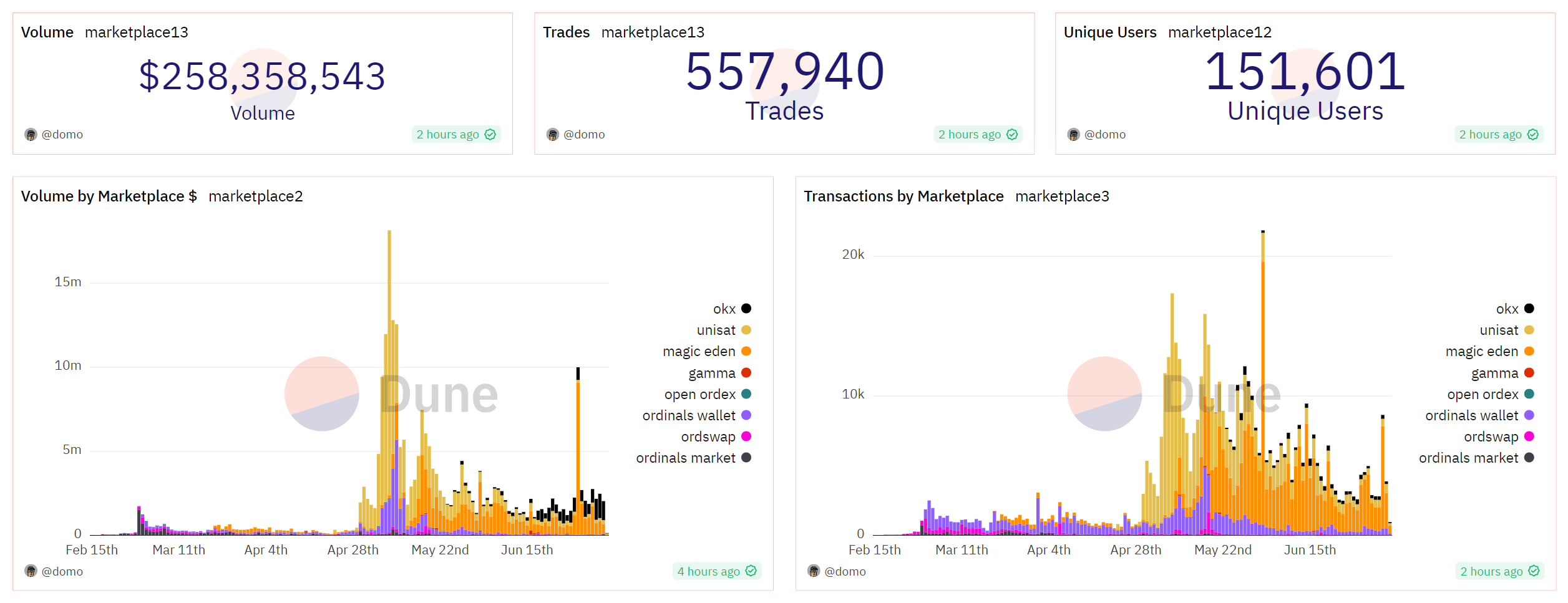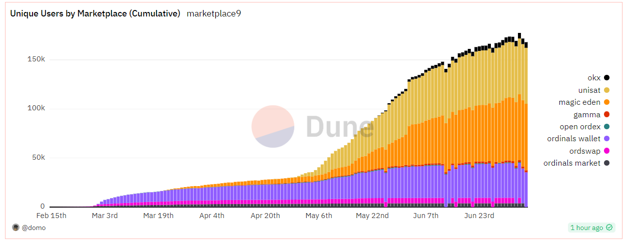 Панель аналитики блокчейна Dune, отражающая несколько показателей рынка Bitcoin Ordinals от пользователя domo, также показывает, что количество уникальных пользователей резко увеличилось с мая 2023 года. UniSat, расширение для браузера Chrome с открытым исходным кодом для Bitcoin Ordinals и токенов BRC-20, Magic Eden и Ordinals Wallet составляют большинство уникальных пользователей на рынке.