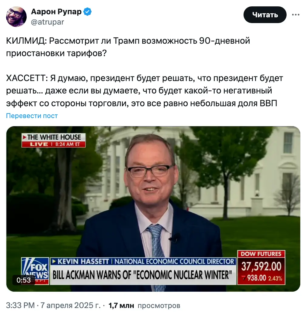 Fox News спросил Хассета, рассмотрит ли Трамп 90-дневную паузу в тарифах, и получил уклончивый ответ.