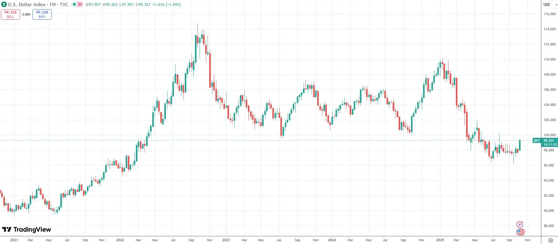 По данным TradingView, в этом году он упал примерно на 12%, с максимума в 110 пунктов в январе до трехлетнего минимума в 96,3 пунктов в середине сентября, после чего немного восстановился в октябре.