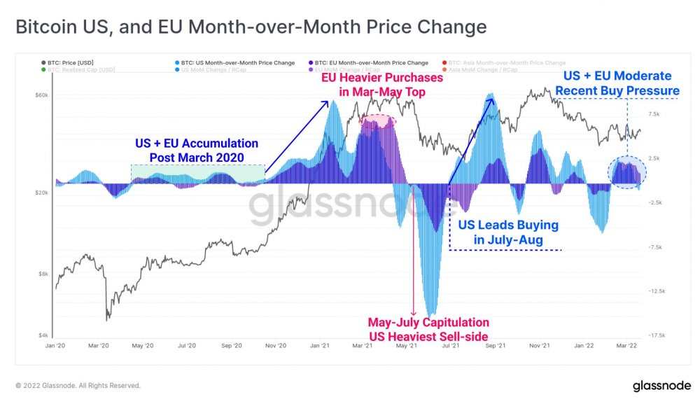 При этом Glassnode сообщил, что азиатские рынки, напротив, в целом предлагали более низкую поддержку со стороны покупателей в течение 1-3 кварталов 2021 года и в настоящее время оказывают сильное давление со стороны продавцов. Однако 22 марта соучредитель крипто-инвестиционной компании Three Arrows Capital Су Чжу написал в Твиттере: «Азия безоговорочно делает максимальные ставки BTC», предположив, что краткосрочный рост цен в течение дня был вызван азиатскими трейдерами.