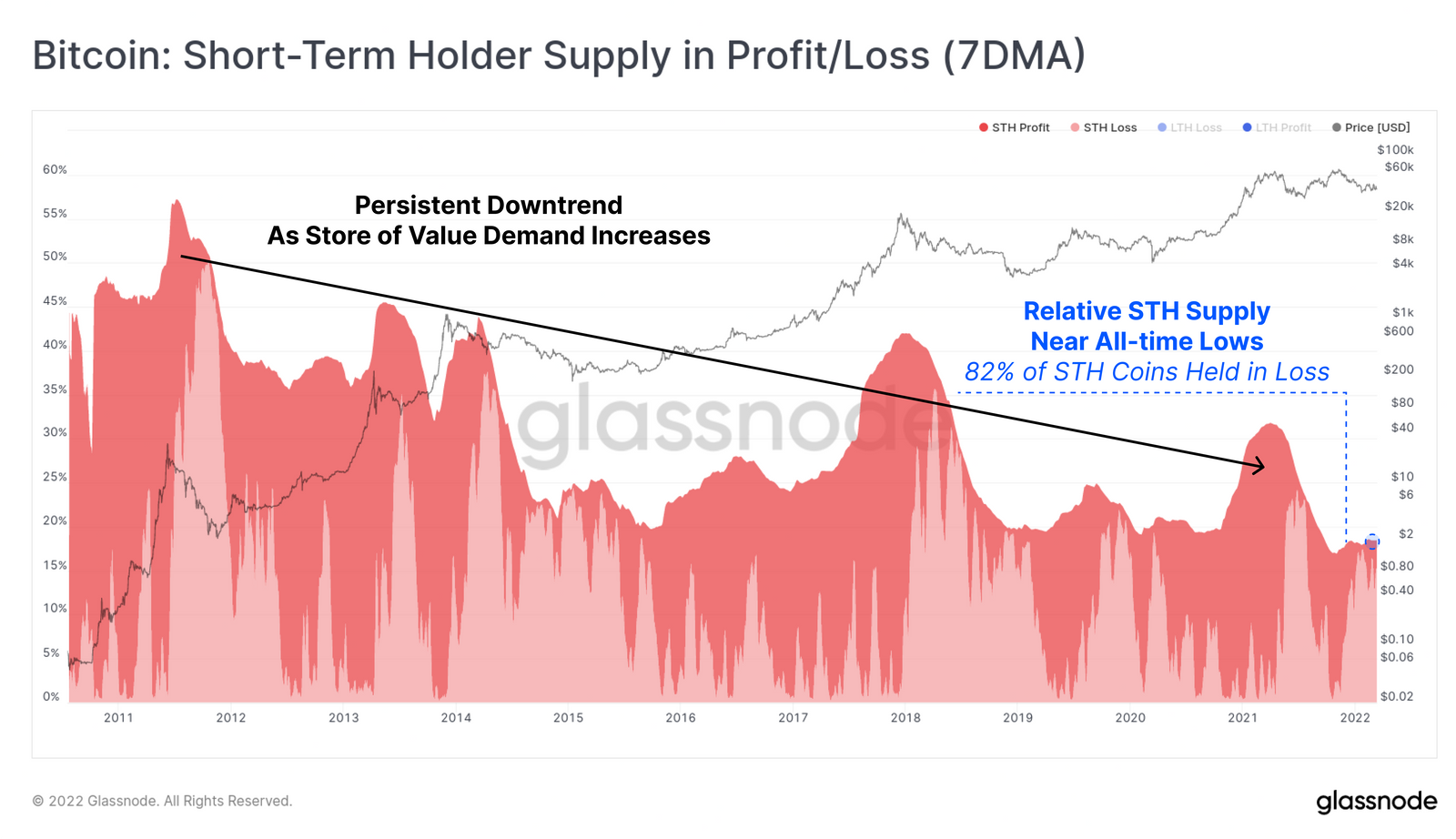 Соотношение прибыль/убыток предложения STH по-прежнему близко к историческому минимуму, установленному в середине 2021 года. В настоящее время 82% монет STH находятся в убытке, что, по словам Glassnode, является признаком более поздней стадии медвежьего рынка, когда сообразительные инвесторы отправляют свои монеты в холодное хранилище, чтобы дождаться возврата к положительной норме прибыли.