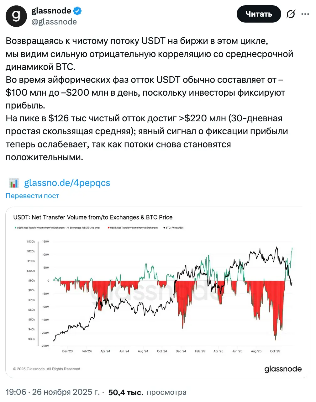 «В периоды эйфории USDT обычно уходит с бирж в объеме от –$100 млн до –$200 млн в день, когда инвесторы фиксируют прибыль, — пояснили в Glassnode. — На пике в $126 тыс (в октябре) чистый отток достиг >$220 млн (30‑дневная скользящая средняя). Это явный сигнал фиксации прибыли, который сейчас ослабевает, поскольку потоки снова становятся положительными».